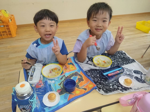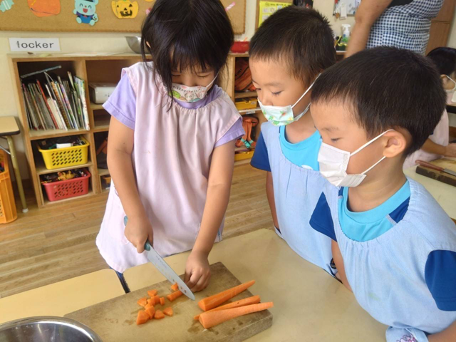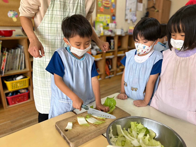 子どもたちが楽しみにしている活動の一つです。実際に自分たちで作った料理は特においしく、好き嫌いも少なくなってきます。 また、お友だちと協力しての計量・ミキシング等を通して、作る喜び、マナー、感謝の心を学んでいきます。